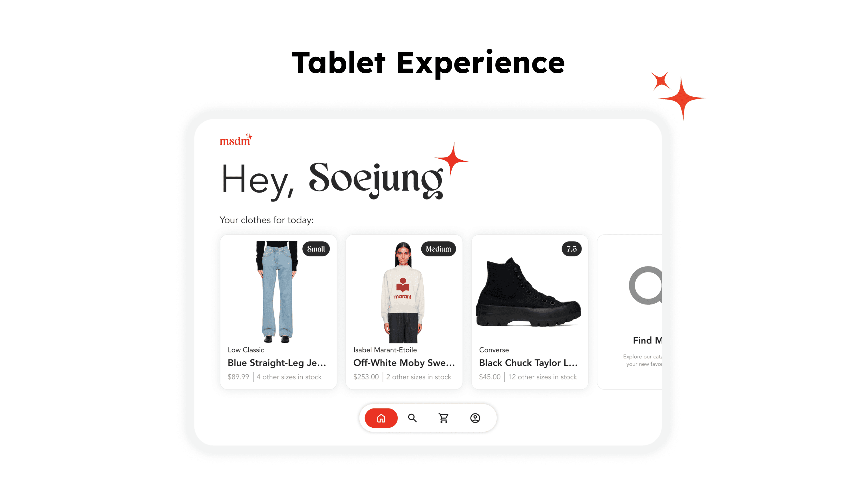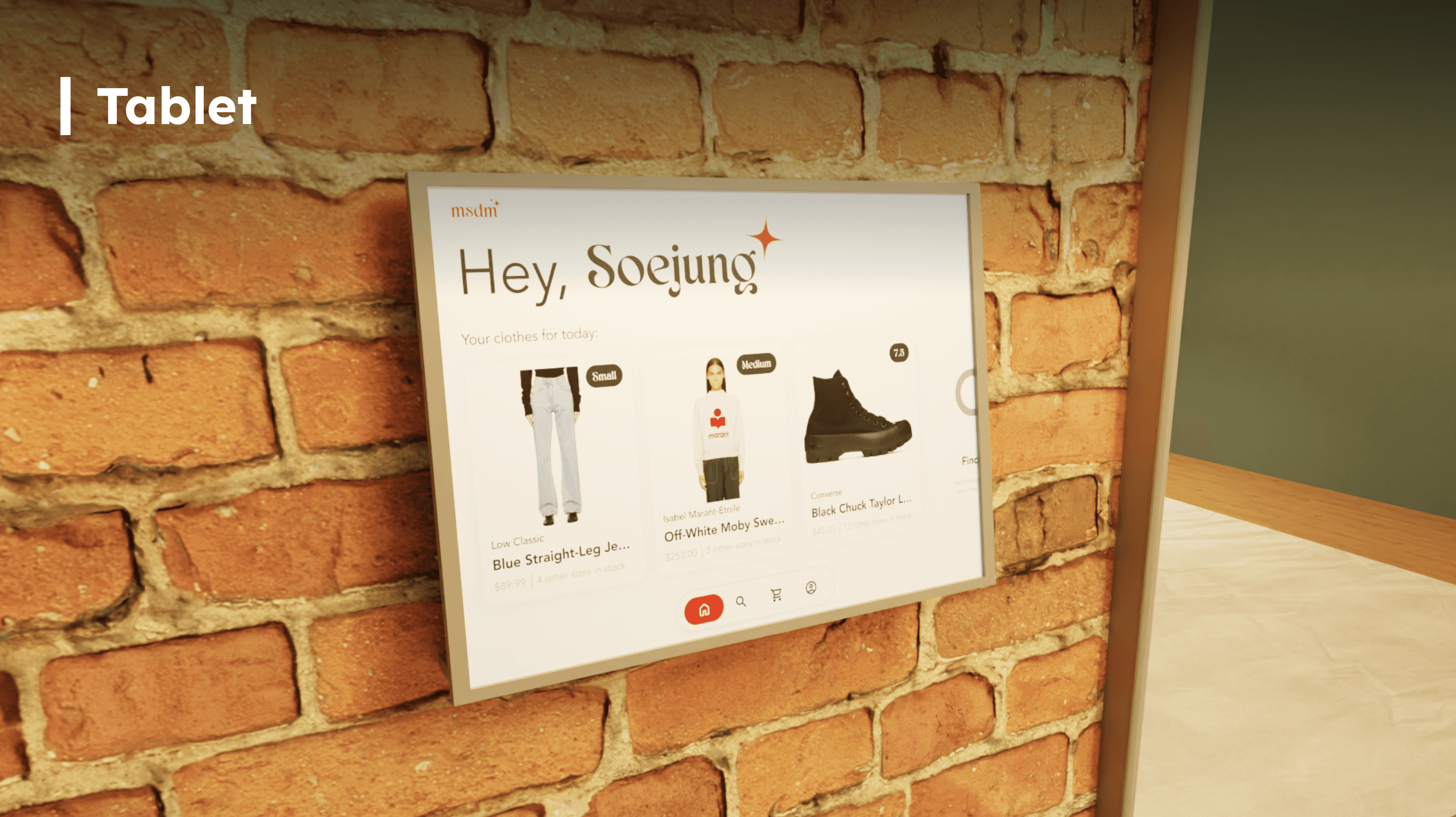 The customer will spend their entire “shopping” experience sitting in a cozy room and browsing items through a wall-mounted tablet. If they find an item they’d like to try-on, they would order it through the tablet and an employee would deliver it to them. This way, the tablet would act like a quiet, non-intrusive assistant.