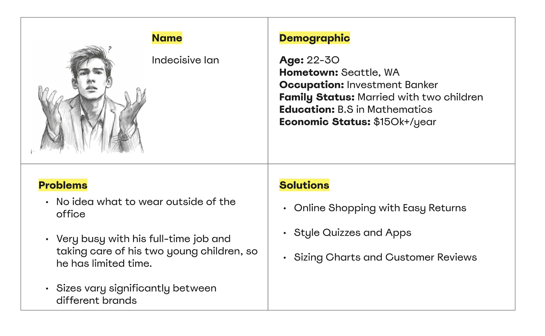 Combined with other interviews and our personas (Indecisive Ian, Overwhelmed Olivia), Lisa’s feedback illustrated a pattern impossible to ignore: