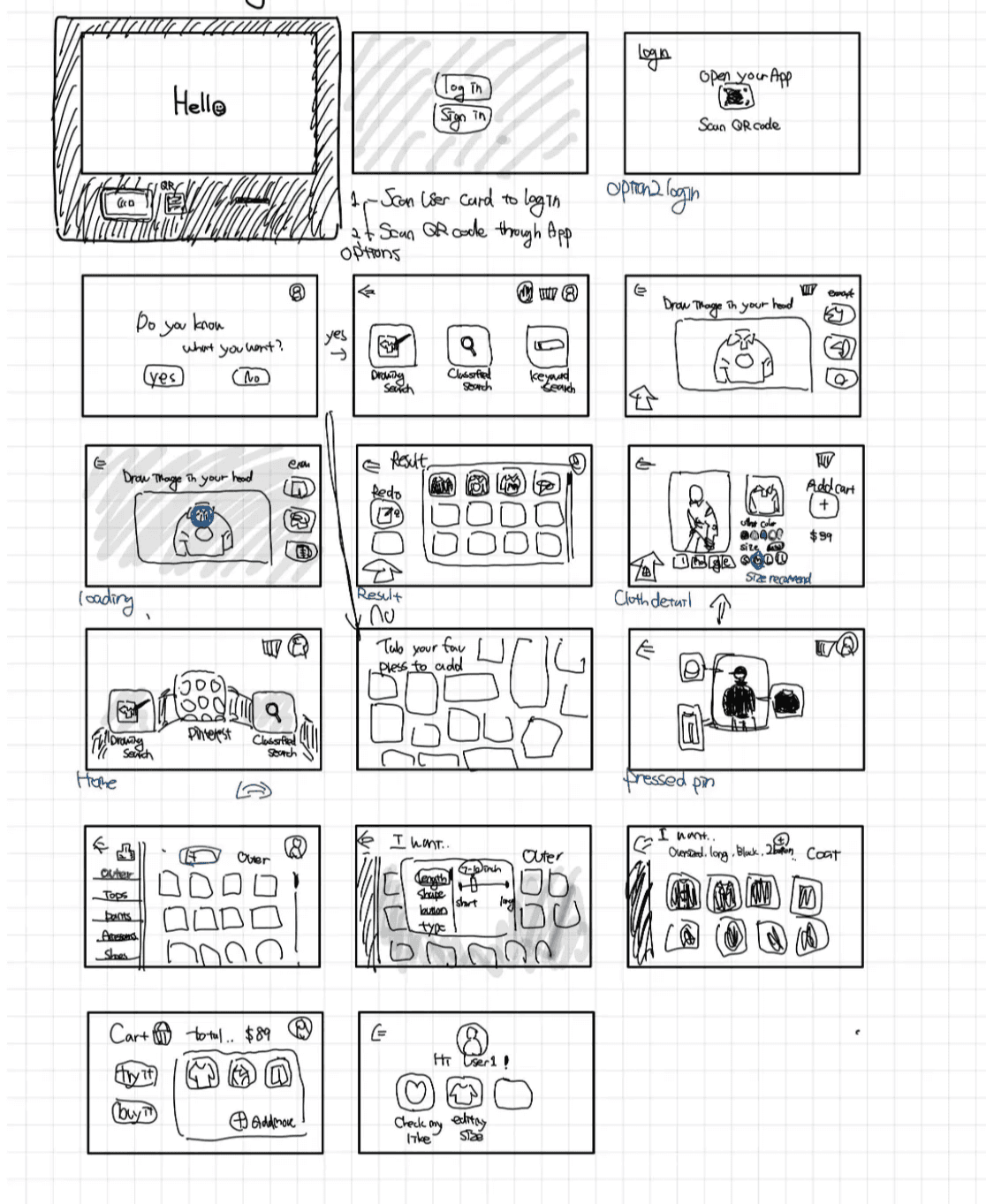 Instead of segmenting the store based on different styles, why not present a kiosk for the shopper once they enter so we can better guide them through the store? The following is the design of the kiosk’s flow.