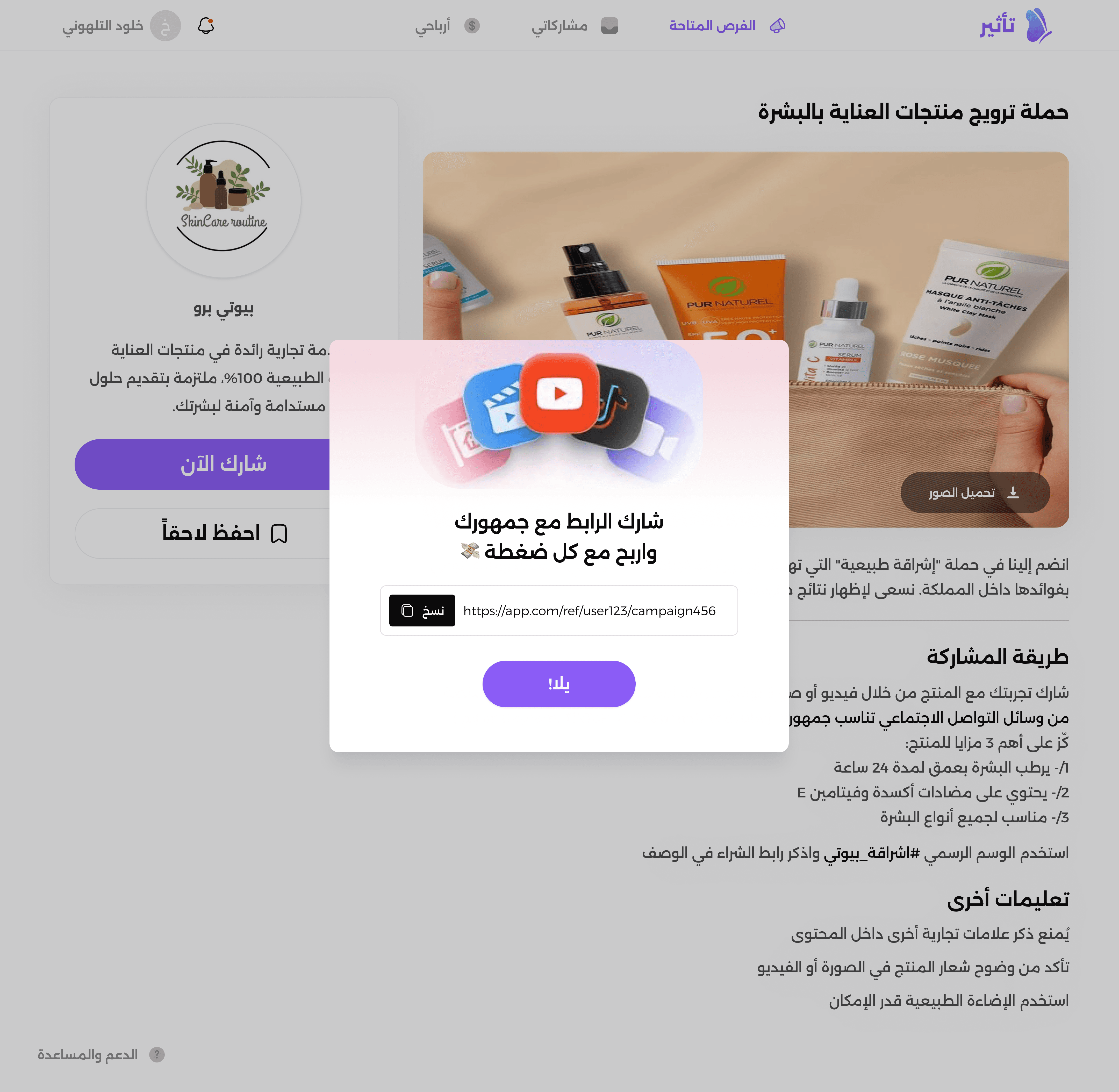 We realized advertisers already had good raw material: their website. So we wired up a feature: Paste your URL, and Tatheer uses AI to draft a campaign description, with suggested visuals, and example copy that creators might post.